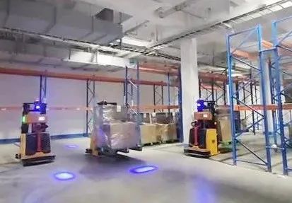 当包装材料库收料时由人工叉车运至收料区再由AGV运送至货架或指定区域,完成自动发料时由AGV运送各类包装材料到机台指定存放点。